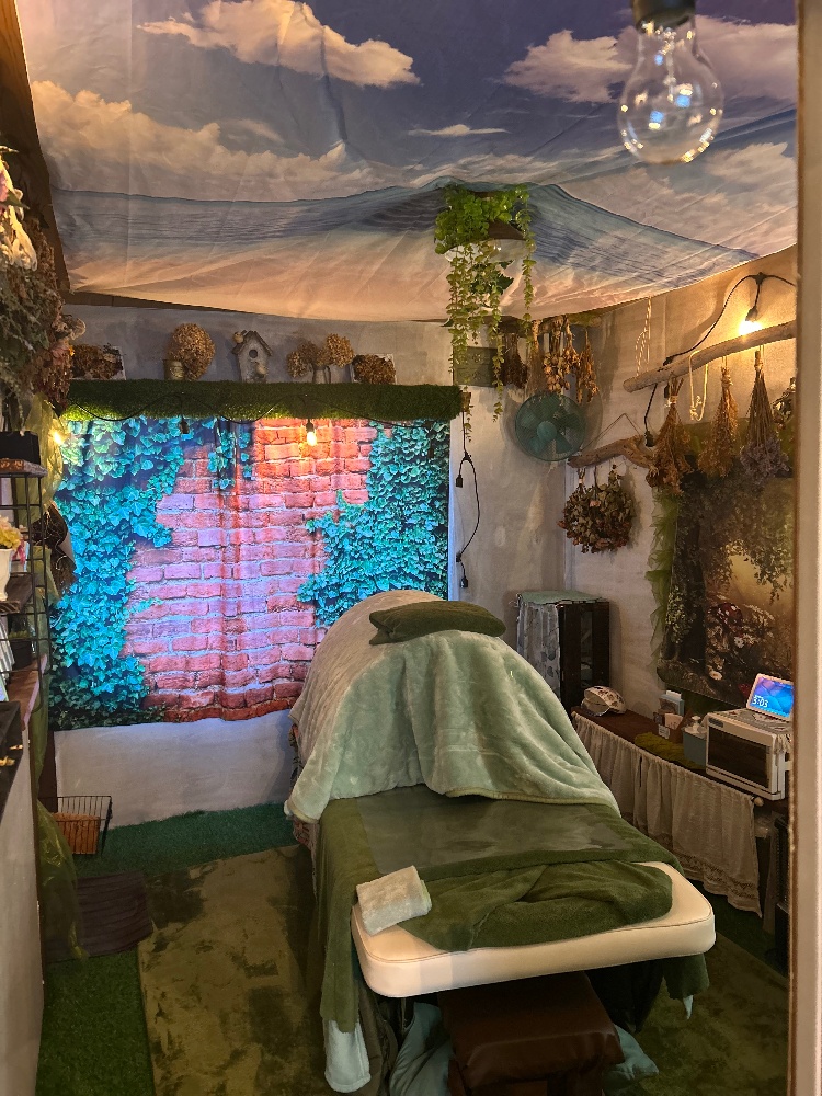 自然の中で自己を開放してリラクゼーションを感じで頂けるよう施術ルームは緑、ドライフラワーを基調とした空間となっております。どうぞ、心も体も身を任せゆっくりとした時間をお楽しみください。